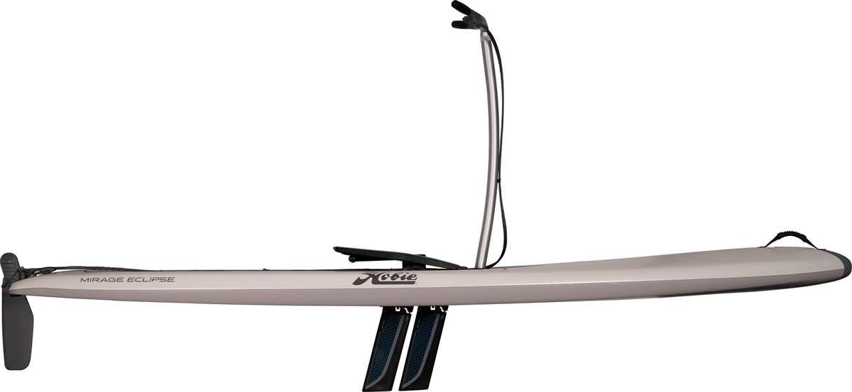 Walk on water aboard the Eclipse, a new and incredibly stable Hobie watercraft! No need for a paddle, a natural walking motion on the pedals powers the powerful Mirage Drive fins underwater and propels the Eclipse whether on a slow ride, or a sprint into the wind. Steer with agility thanks to the steering handle that activates the self-lifting rudder. Simplified equipment for minimum preparation time. From the car, the pontoon or your boat, you’re in the water in a minute! Set off on your own, with a friend or in a group. The Eclipse allows you to do fitness on the water and under the sun. The board is lightweight, made from durable materials and packed with clever features like turnbuckles and a self-lifting rudder. The Eclipse takes stand-up paddling to a new level.