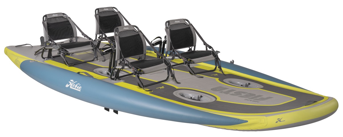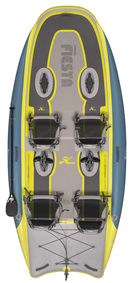 Included with the four seats and two MirageDrive GT Kick-Ups is a three-piece SUP paddle, a high-pressure hand pump, a high-volume electric pump and a storage bag. The two additional Mirage Drive GT Kick-Ups are optional.